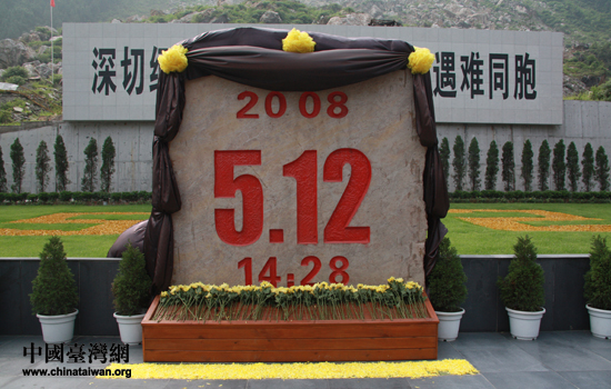 “5·12”地震紀念碑,擺滿的鮮花寄托著嘉賓們對逝者的哀思與悼念。(中國臺灣網 趙輝 攝)