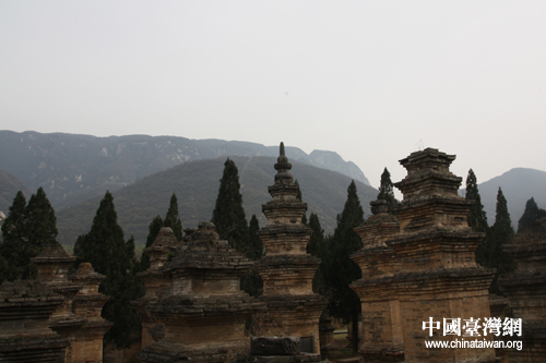 蒼茫的少室山與歷史悠久的塔林建筑(中國臺灣網 趙輝 攝)