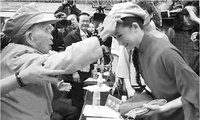 在海南瓊州,101歲的“紅色娘子軍”老戰士王運梅為芭蕾舞演員朱妍戴上軍帽。