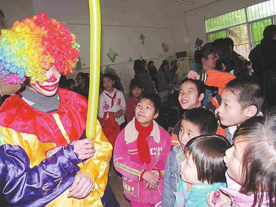 愛(ài)心網(wǎng)友小丑叔叔為孩子們帶來(lái)禮物 本報(bào)記者黃登攝