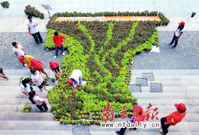 南方日報9月21日報道9月18日,在學生代表及眾多市民的參與下,用廣州市民親手種植的2010盆愛心亞運花卉拼砌而成的亞運會徽“五羊圣火”誕生。