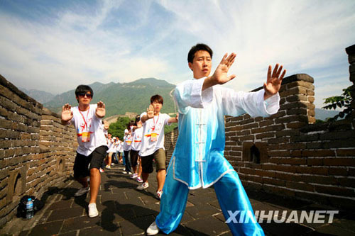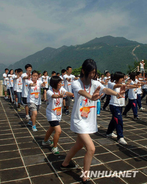 7月15日,參加“兩岸青年舞太極聚長(zhǎng)城”活動(dòng)的學(xué)生在長(zhǎng)城上學(xué)練太極。新華社發(fā)(卜向東 攝)