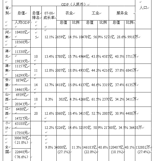 表一 中部六省國民經(jīng)濟現(xiàn)況,2008