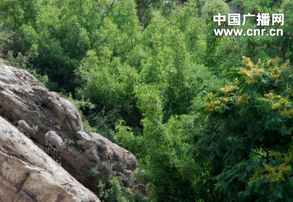 寧夏銀川市,賀蘭山巖畫景區(qū),巖羊母子在優(yōu)美的環(huán)境中散步。