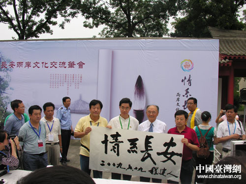 最后在主辦方再三邀請下,“情系長安——兩岸文化聯誼行”臺灣嘉賓團團長程建人先生登場,寫下了“情系長安”四個大字。自謙“不會寫字”的程建人的字卻得到現場熱烈的掌聲。