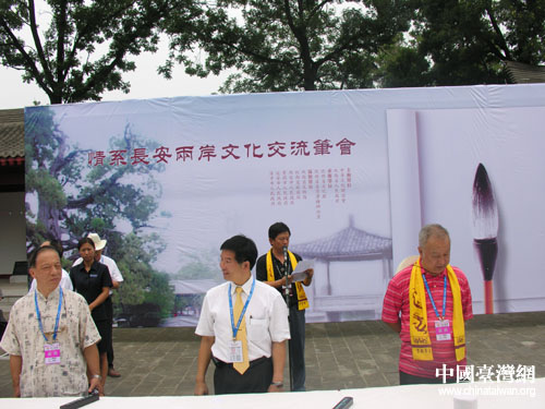 中國臺灣網7月20日陜西黃陵縣消息 7月19日,參加“情系長安——兩岸文化聯誼行”活動的96位臺灣文化界人士,在黃帝陵恭祭軒轅黃帝,并在祭陵結束后來到軒轅廟古柏院。兩岸的書法家代表在千年古柏樹下,進行了一場別開生面的文化交流筆會。