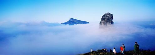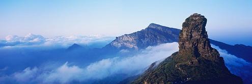 梵凈山很奇特、險(xiǎn)峻,尤其引人入勝的是新金頂,在海拔約2200余米的崇山峻嶺上,突起一個(gè)山峰,像陽朔的丹霞一樣,但是,只有一個(gè),高約100米,如巨筍出土,常常紅云環(huán)繞(哈蘇6x6的片子有反映,另貼),直插蒼宇,令人震撼。1618年,奉圣旨立碑曰:“眾名岳之宗”,可見梵凈山在皇帝眼里的位置了。