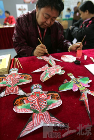 11月18日,民間藝人在北京文博會上現場制作微型風箏。
