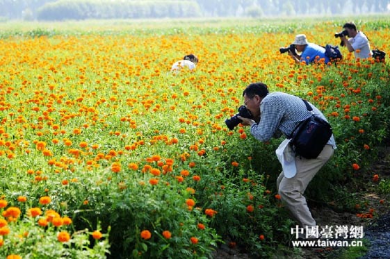 中國(guó)臺(tái)灣網(wǎng)8月14日銀川消息 8月14日,參加2013年全國(guó)網(wǎng)絡(luò)媒體寧夏行的記者被平羅的色素菊盛開(kāi)的色素菊迷醉,大家紛紛拿出各種攝影器材爭(zhēng)相拍照留念。