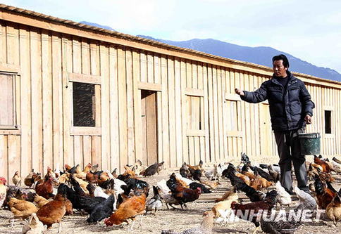 資料圖片:尼瑪在西藏米林縣一養殖場為飼養的藏雞喂食,他在當地政府支持下,從2007年開始飼養藏雞、藏豬,現年收入已達6萬元(1月11日攝)。新華社記者陳建力攝
