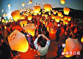 祈愿靠天燈。昨晚超過6萬民眾涌入臺北縣平溪鄉(xiāng)放天燈,看著天燈冉冉升空,眾人不時發(fā)出驚嘆聲。昨晚共施放12波2600個天燈,多數(shù)民眾心愿都是期待賺錢或身體健康。來源:臺灣《蘋果日報》
